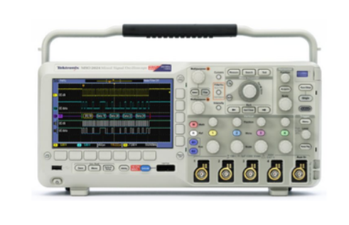Equipo para mediciones en laboratorio de 500 MHz, 4 canales analógicos, 16 canales digitales. Utilizado para pruebas y validación de sistemas electrónicos analógicos y digitales.